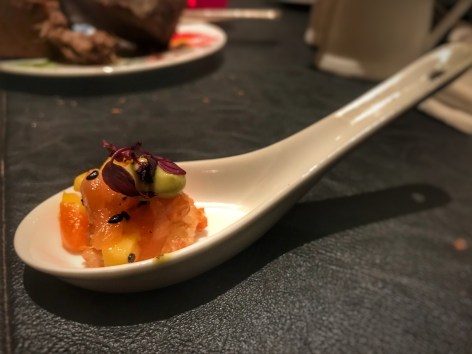 And start tickling your palate with a spoon of salmon tartare topped with edamame.