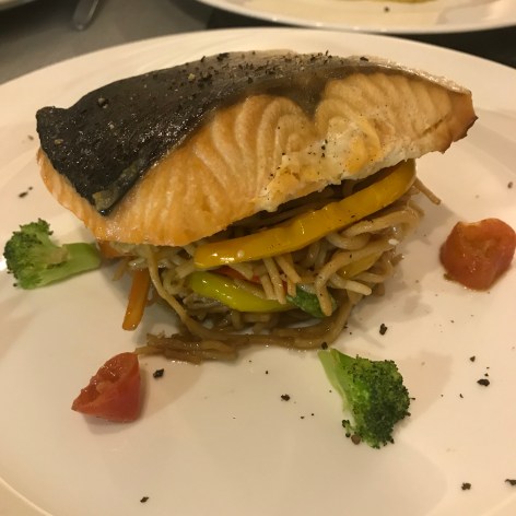- Grilled Salmon over noodles with veggies which again could be better replaced with spinach, vegetables alone or potato wedges